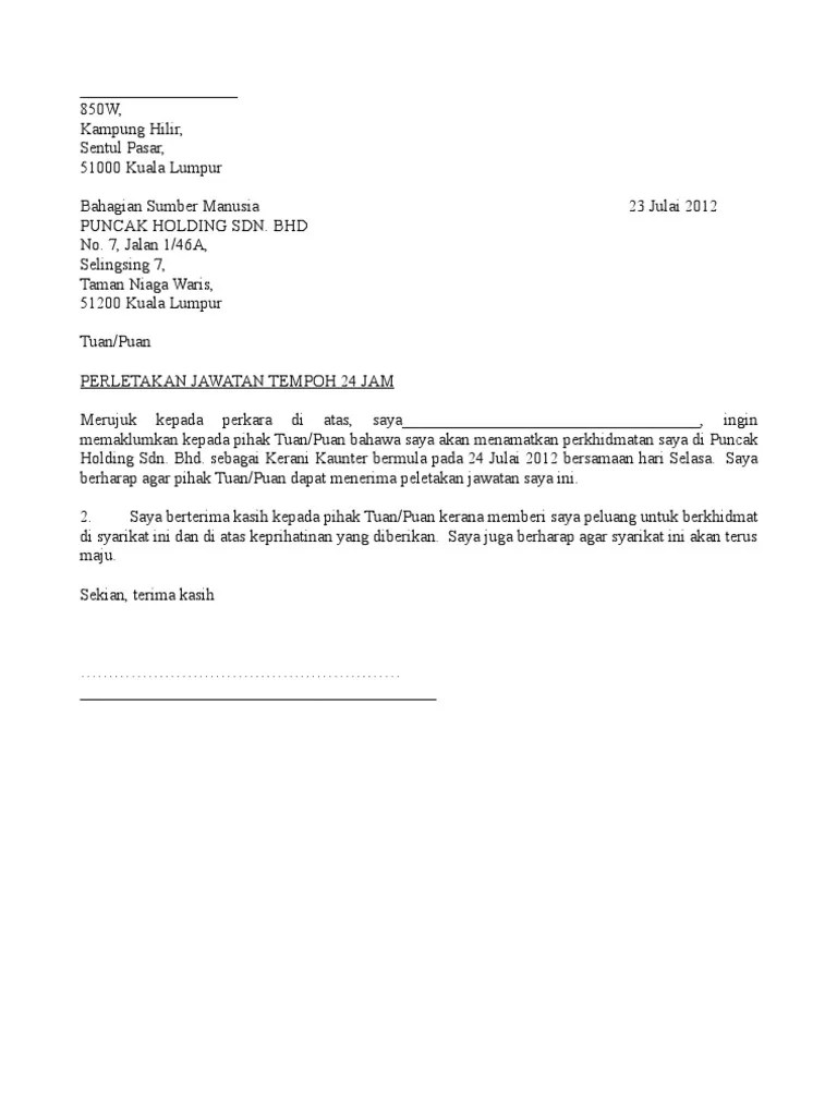 Contoh surat berhenti kerja notis 24 jam. Ini sesuai pada yang mahu berhenti kerja serta merta. Manager Dear Sir.